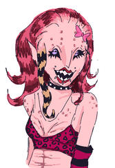 Nessa bore hot pink tendrils for hair and various lip piercings. Her tongue would also be pierced and she is regularly seen with flashy clothes and decorates her body with accessories. Strange markings can be seen littered on her body.