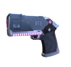 Given by her family as a form of protection. Its sleek, streamlined body is coated in a pink, which was requested by Nessa. It features a neon glow when activated. It ensures a comfortable grip for her, and has a low recoil for her petite frame. A small accessory is attached to it, seeming to be a pink octopus with a large smile.